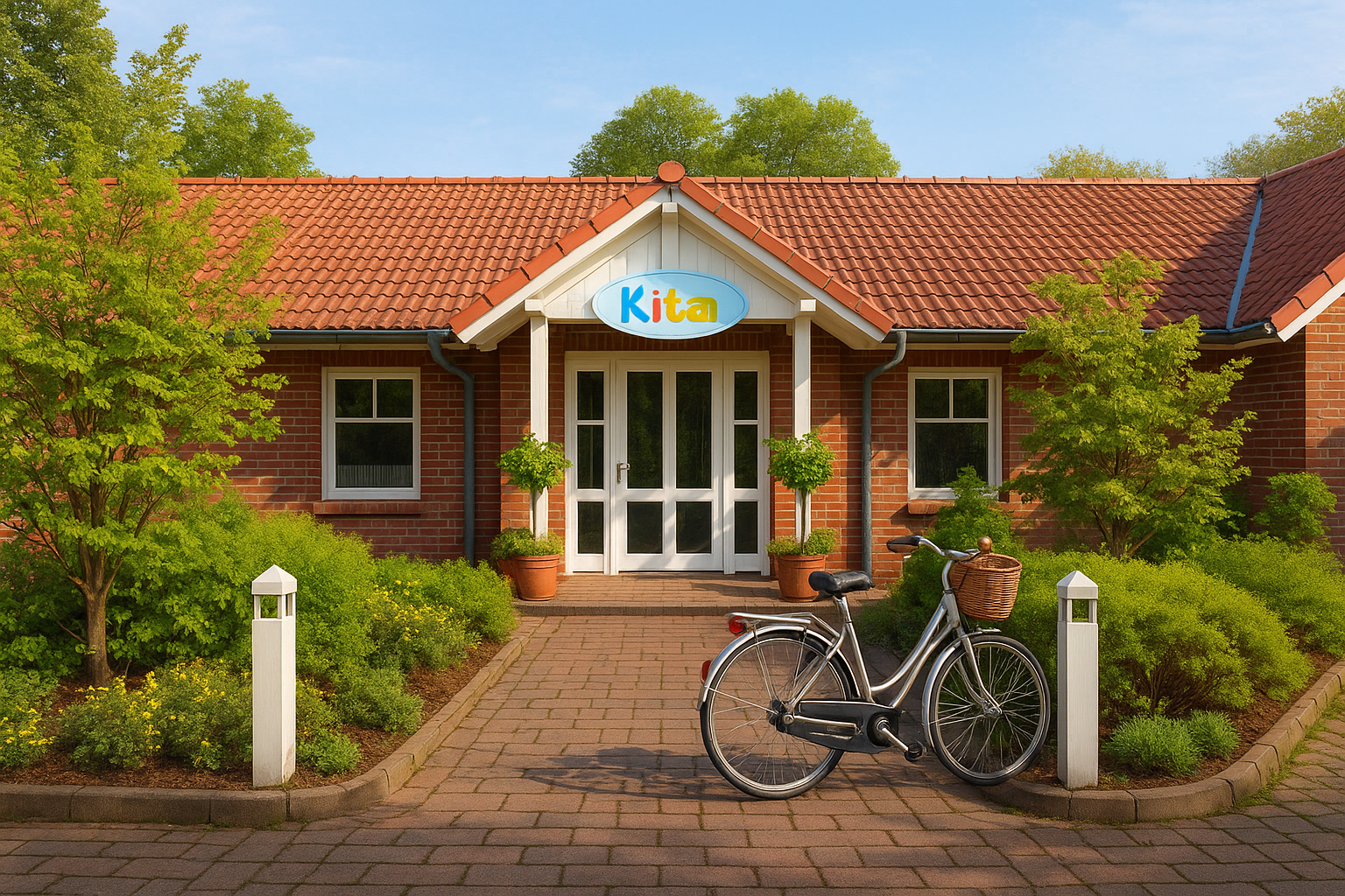 Unsere Kita ist architektonisch sehr ansprechend gestaltet, mit einer integrierten Bewegungshalle als Mittelpunkt. Hier gibt es ein großes Spielgerät zum Klettern und Schaukeln, Matten, Langbänke, Schaumstoffelemente und ein großes Bällebad.